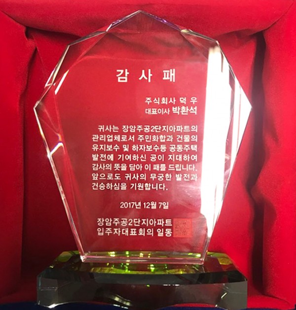 ■ 장암주공2단지 입주자대표회의로부터 감사패를 받았습니다.