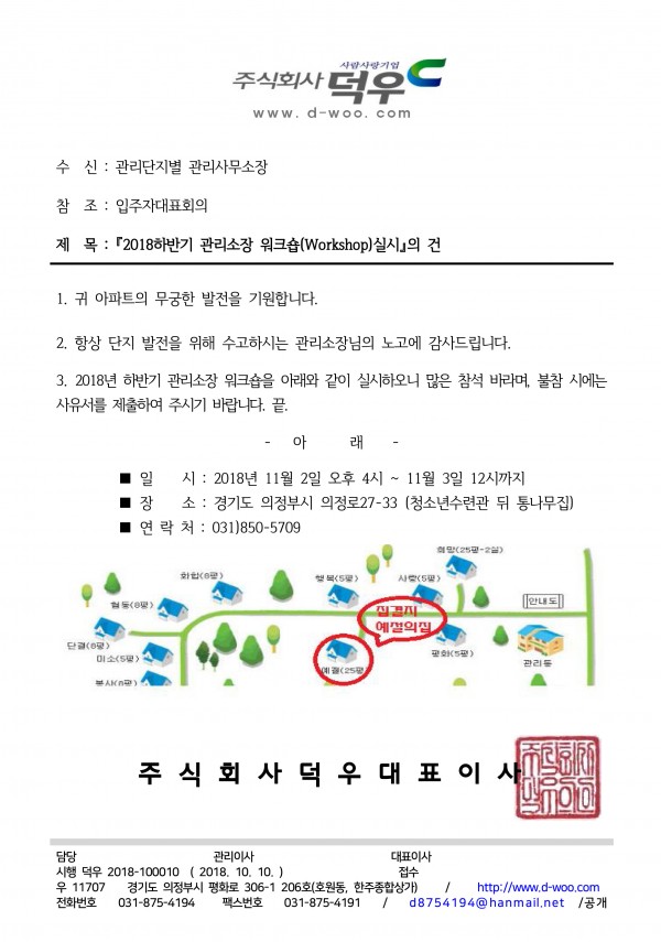 ■ 2018년 하반기 관리소장 워크숍(Workshop) 실시 ■ 페이지 정보 작성자 최고관리자 (115.♡.139.242) 작성일18-10-10 16:58 조회10,494회 댓글0건 관련링크 이전글 다음글 목록 본문 많은 참석 바랍니다...^^ 댓글목록 등록된 댓글이 없습니다. 이전글 다음글 목록